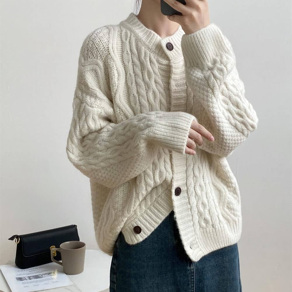 Gilets Femme,Pulls Pour Femmes Tricotés Cardigans Manteau Vintage Beige Cable Jacquard Col Rond Cardigan Bouton Manches Longues Open Front Cardigan …