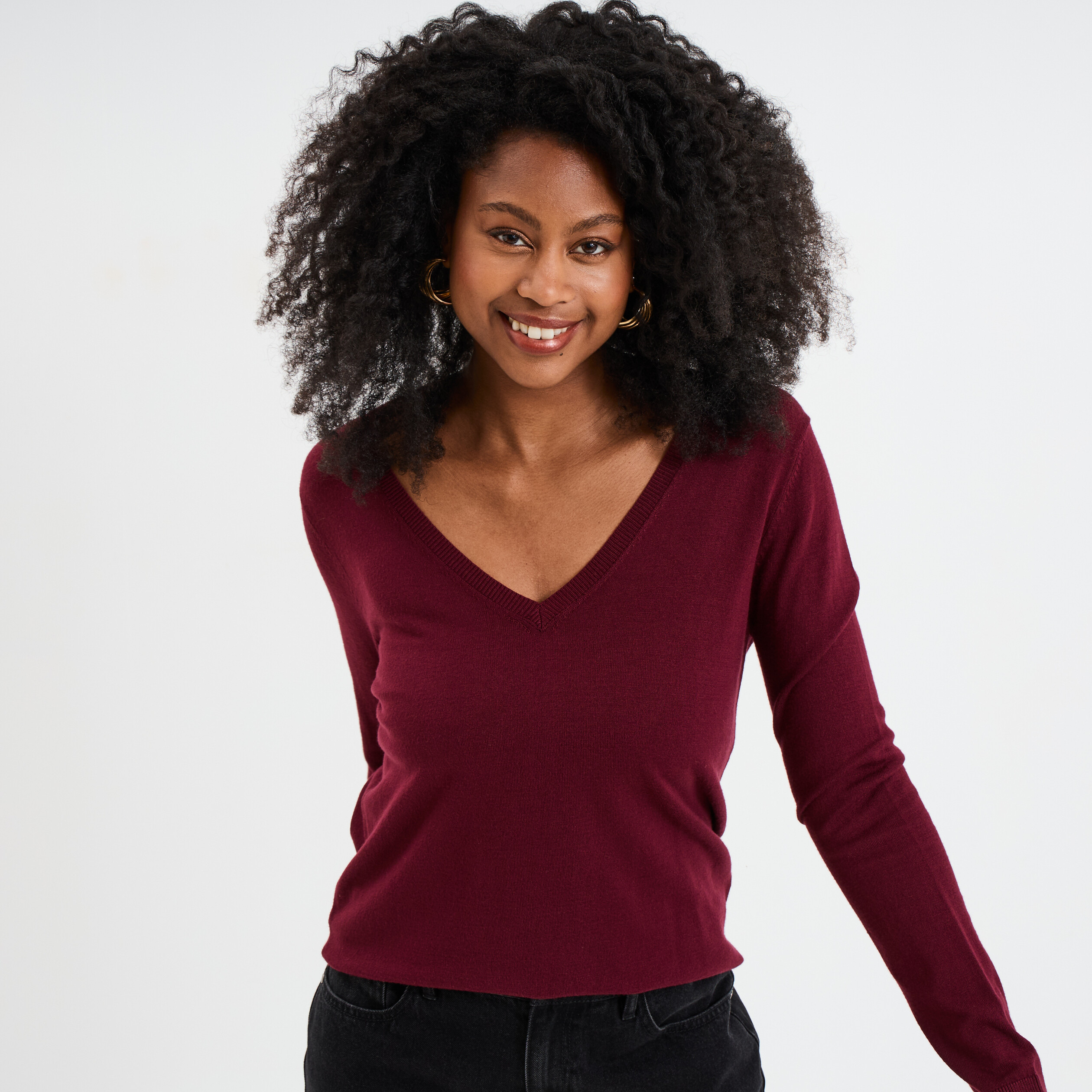 Pull col en V manches longues bordeaux femme