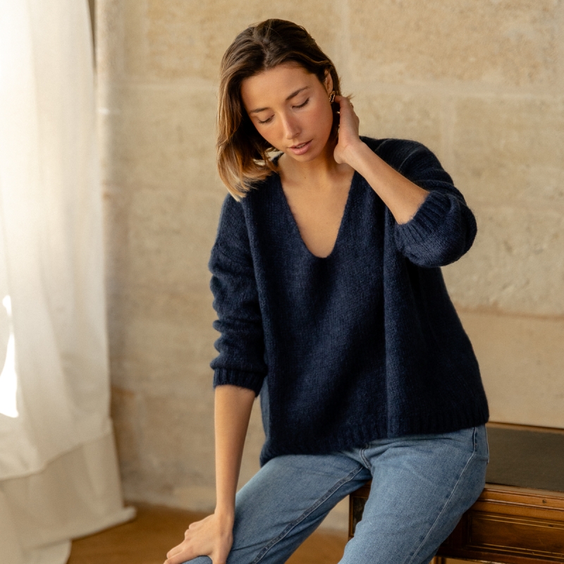 Pull col V en mohair, bleu marine Perrine & Antoinette