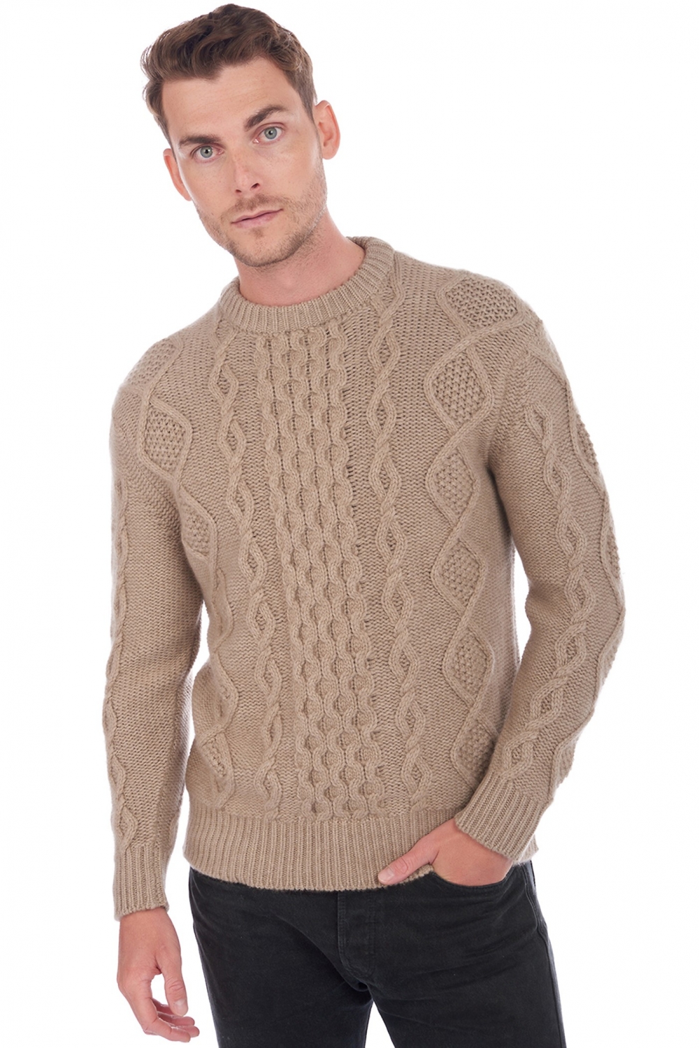 Pull col rond esprit irlandais. Maille épaisse en cachemire 12 fils. Superbe jeu de torsades et finitions impeccables en côtes 1×1 de 7 cm sur le bas du pull et aux poignets