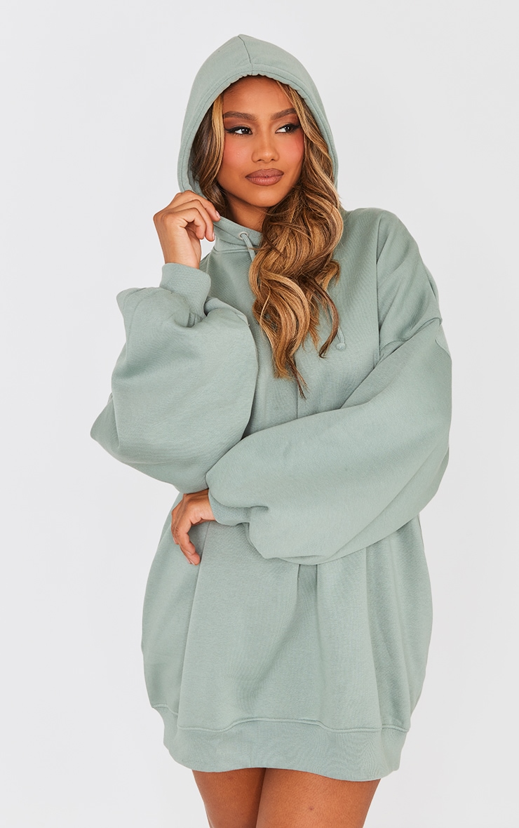 Robe pull oversize en sweat bleu vert à capuche